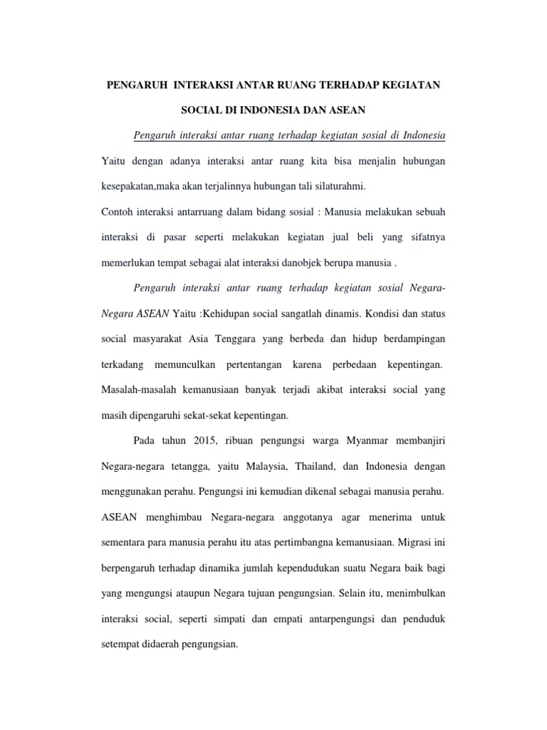 Hubungan antar manusia tidak akan terjadi tanpa adanya interaksi sosial. Kesepakatan ini dilakukan agar daya saing asean meningkat serta bisa menyaingi tiongkok dan india untuk menarik investasi asing. Pengaruh interaksi antarruang terhadap kegiatan ekonomi, sosial dan budaya di indonesia dan asean a. Pengaruh perubahan dan interaksi ruang antarnegara terhadap kehidupan ekonomi. Banyak daerah di asia juga yang telah berubah menjadi daerah perkotaan.
